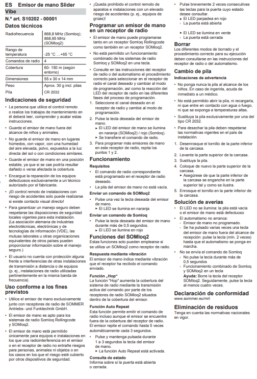 • Retrocompatible con automatismos y receptores de radio con sistema de radio Somloq Rollingcode (FM 868,8 MHz).